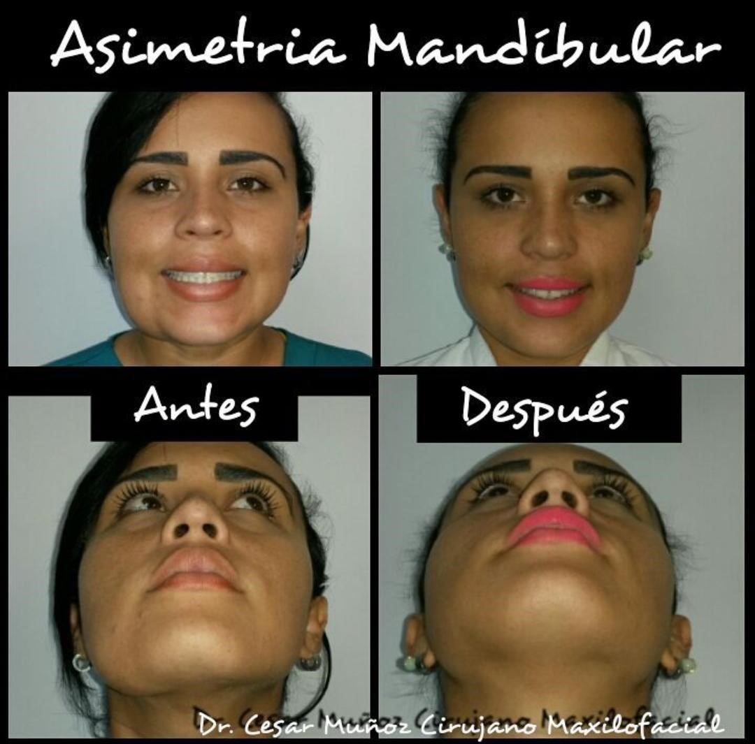 En este caso la asimetría mandibular es producto de una lesión de tejido blando (Lipoma), a nivel de ángulo mandibular derecho. Post operatorio de 6 meses de evolución, se aprecia: simetría y plenitud de tercio inferior facial, sin estigmas de abordajes faciales; Cabe destacar se realizó abordaje intraoral con identificación y preservación de nervio mentoniano