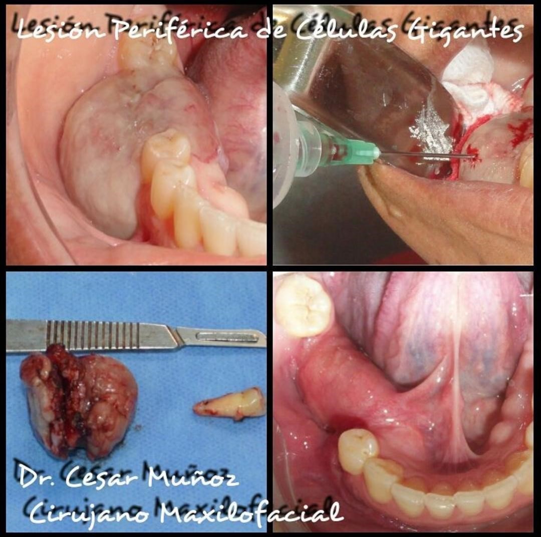 La lesión Periférica de Células Gigantes es una lesión tumoral de carácter inflamatorio crónico benigna, que se presenta en los tejidos gingivales, esta lesión es reactiva a traumatismos, y se localiza en la encía o en el reborde alveolar edéntulo con predominio en región mandíbular. En este caso se trató de paciente femenina de 42años de edad, quien inicio enfermedad actual hace 2 años al presentar aumento de volumen circunscrito y progresivo en el tiempo, doloroso, de consistencia firme, con episodios de sangrado, todo esto posterior a extracción de 1er molar derecho. Razón por la cual se realizó punción aspiración y biopsia incisional, reportando (lesión Periférica de Células Gigantes). En vista de compromiso del ligamento periodontal y movilidad grado IV del 2do premolar inferior ipsilateral se realizó extracción del mismo. En seguimiento anual no se aprecia signos clínicos de enfermedad