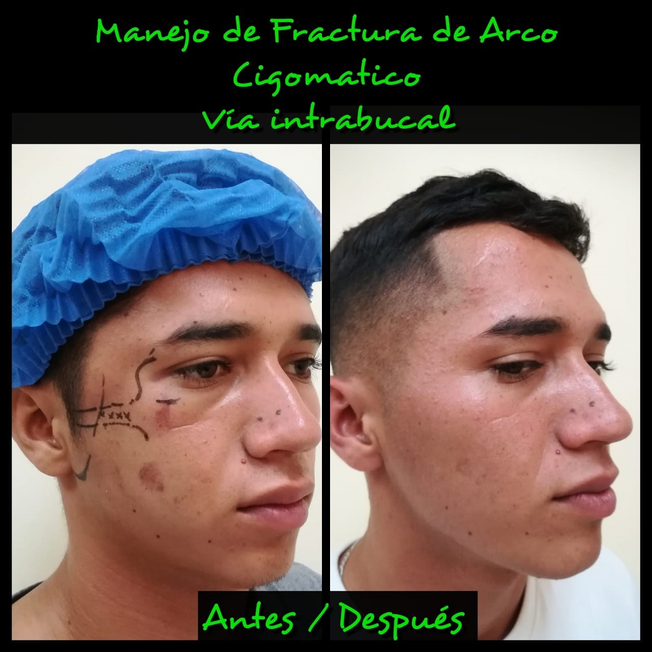 Este tipo de fracturas aisladas, representan menos del 10% de las injurias cigomáticas, ellas pueden provocar limitación severa de la apertura bucal, como en este caso, y alteraciones en la estética. NOTEN LA DEPRESIÓN EN EL AREA MARCADA CON XXXX; y Posteriormente, en la siguiente imagen se observa la proyección ideal transversal de la cara. En este caso se realizó Reducción Cerrada de Fractura del Arco Cigomático Vía Intrabucal